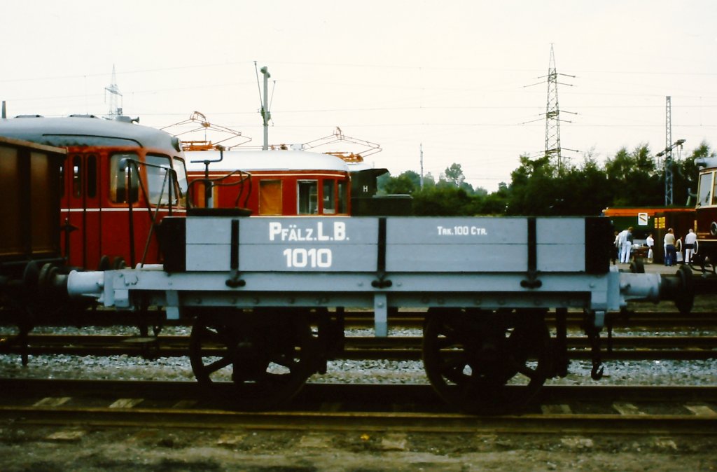 Offener Güterwaggon der Pfälzischen Ludwigsbahn auf der Fahrzeugschau "150 Jahre deutsche Eisenbahn" vom 3. - 13. Oktober 1985 in Bochum-Dahlhausen