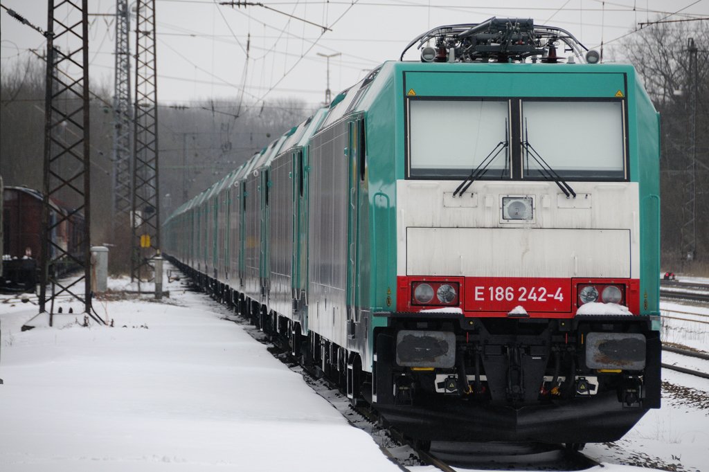 Lokportrait von der Spitze des "Spitzen-Lokzuges": 186 242-4 auf Gleis 1 in Neuoffingen. (29.01.2010).