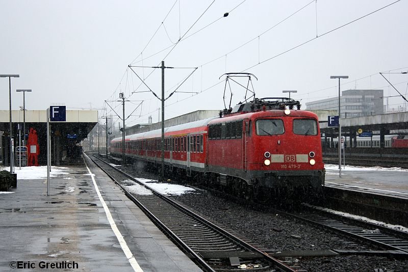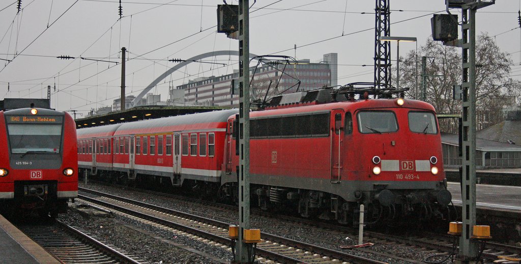 110 493 mit einem Pbz im Bahnhof Köln Messe/Deutz, leider spielte das Wetter nicht mit, dann stand die Lok genau vor den Signalen und als sie losfuhr fuhr auch der ET aus und versperrte so nochmal den Weg für ein gutes Bild. 27.12.09