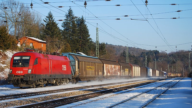 1116 002 mit Audi Güterzug 47126 auf dem Weg von Györ nach Ingolstadt bei der Durchfahrt in Tullnerbach-Pressbaum am 27.1.2010.