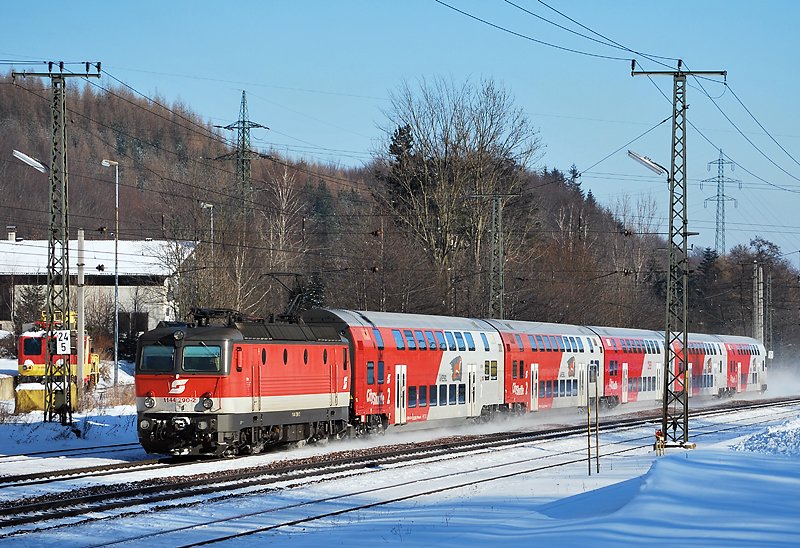 1144 290 samt DS Garnitur als REX nach Amstetten bei der Durchfahrt in Rekawinkel am 27.1.2010.