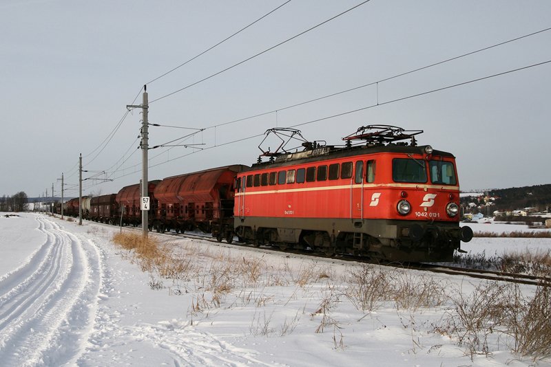 29.1.10 Nur noch 8 1042er sind im Betriebsbestand der ÖBB, wobei die 1042 007 zur Zeit schadhaft ist. Eine Vertreterin der Baureihe war an dem Tag auf der Laaer Ostbahn mit Güterzügen im Einsatz. Die 1042 013 bespannte den NG 64203 von Laa an der Thaya nach Kledering.