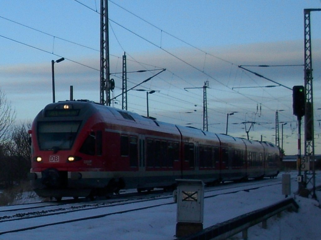 Ausfahrender Flirt nach Rostock bei der Ausfahrt aus Bergen/Rügen am 28.Januar 2010.Das Einfahrsignal zeigte für den Gegenzug bereits Einfahrt.