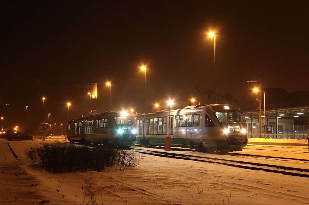 Bf Greiz morgens 03.45 Uhr, die beiden Triebwagen auf Gleisen 5 (VT25) und 4 (VT01) sind schon einsatzbereit, VT01 wird wenige Minuten später am Gleis 1 bereitgestellt und 04.06 Uhr, als VBG83150, nach Gera Hbf abfahren. VT25 folgt als VBG83152 05.17 Uhr. Leider wird der Schloßturm erst ab 05.00 Uhr angestrahlt, so das man die Konturen des Schlosses nur ahnen kann. (28.01.2010)