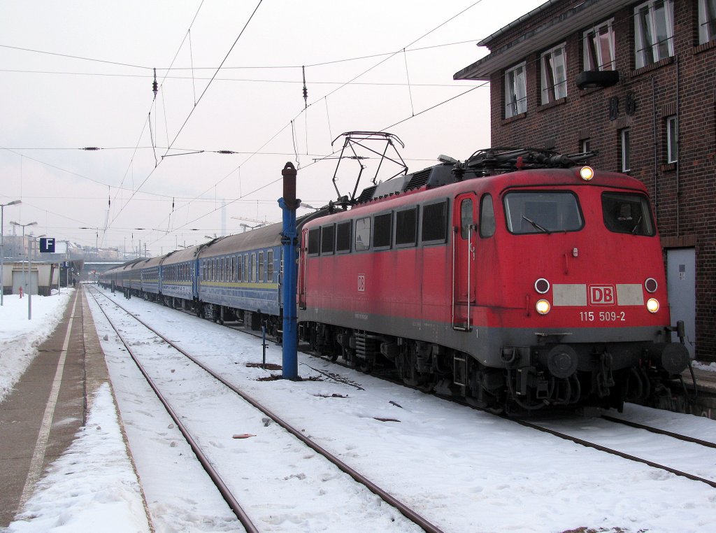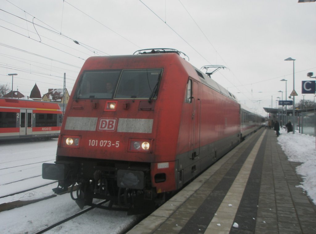 Hier 101 073-5 mit IC2355 von Dortmund Hbf. zum OStseebad Binz, bei der Einfahrt am 29.1.2010 in Angermünde.