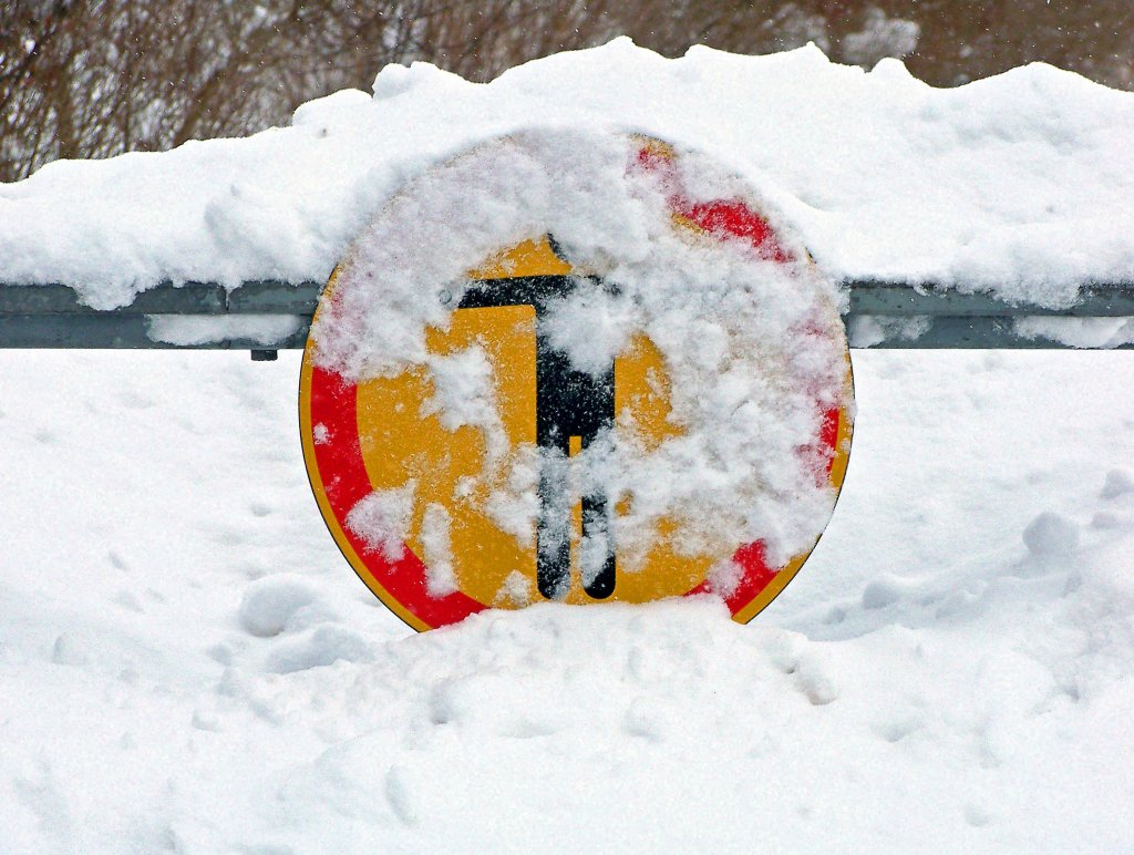 Das Ende-des-Bahnsteigs-Schild des Klingenthaler Bhfs. ist fast vollkommen vom Schnee verschlungen, 29.1.010.