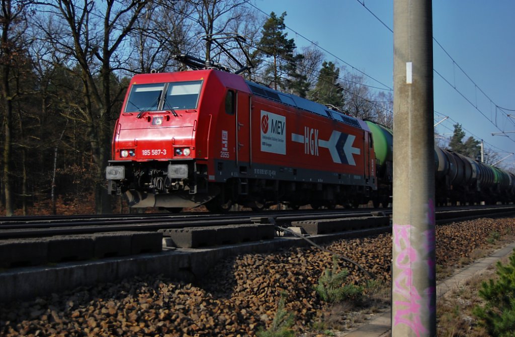 Die 185 587-3 (HGK 2055) mit Kesselwagen am 04.04.2009 Richtung Wustermark/Berlin kurz hinter Rathenow.