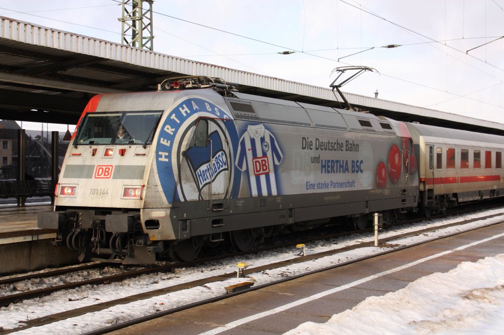 Die Hertha-Lok (101 144-4) zu Besuch in Magdeburg Hbf. Endlich hat es mal geklappt mit einem Foto :-) Fotografiert am 28.01.2010.