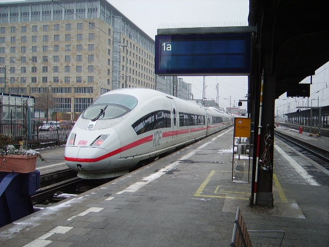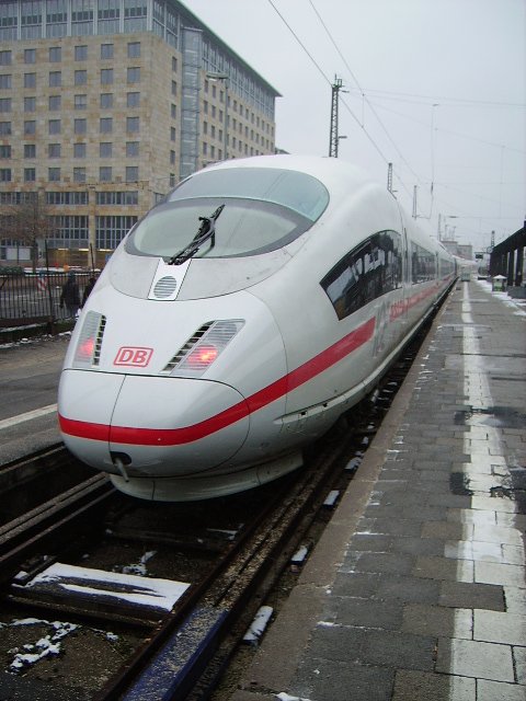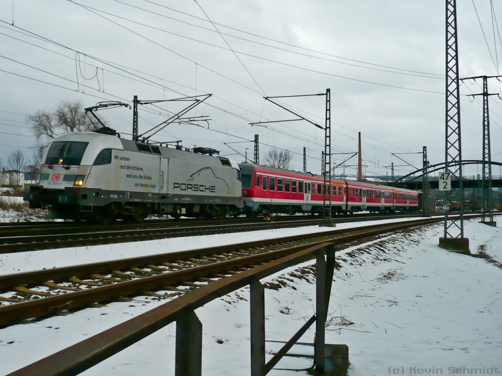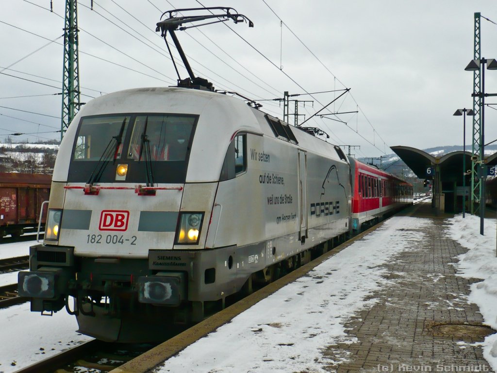 Dieser ganz besonders seltene Gast in Saalfeld (Saale) - der Porsche-Taurus 182 004-2 - steht mit einem hierzulande ebenso seltenen VT 614 auf Gleis 6 zur Überführung nach Cottbus über die Saalbahn und Leipzig. Vorher muss aber noch der verspätete ICE 108 auf Gleis 4 halten und in Richtung Berlin weiterfahren. (29.01.2010) (etwas frontalere Ansicht)