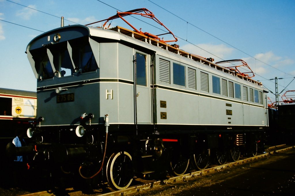 E 75 09 auf der Fahrzeugschau "150 Jahre deutsche Eisenbahn" vom 3. - 13. Oktober 1985 in Bochum-Dahlhausen.