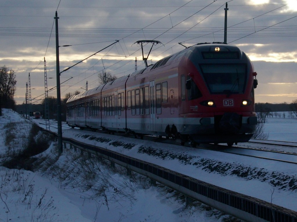 Flirt 429 027 kam, am 28.Januar 2010, mir als RE 33313 Stralsund-Binz vor Bergen/Rügen entgegen.Im Hintergrund der Flirt nach Rostock.