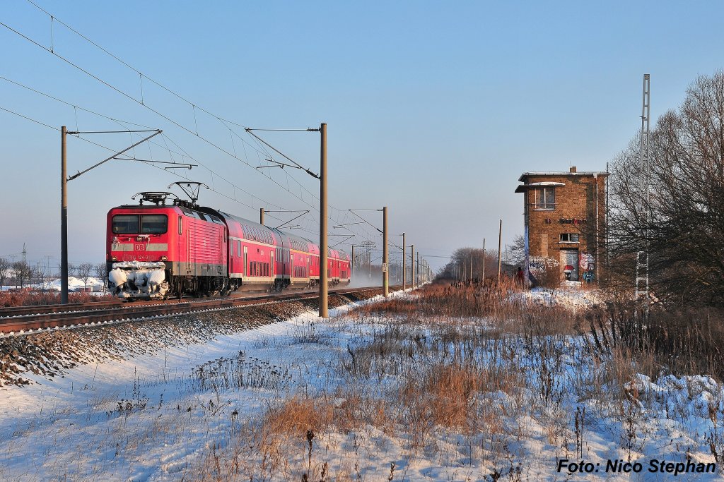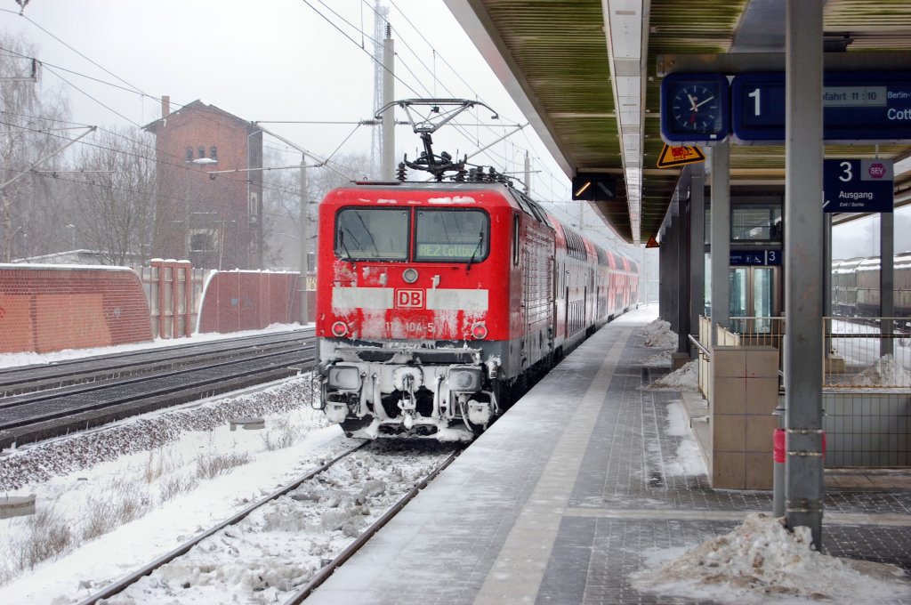 Hier schob die 112 104-5 den RE2 nach Cottbus aus Rathenow am 09.01.2010