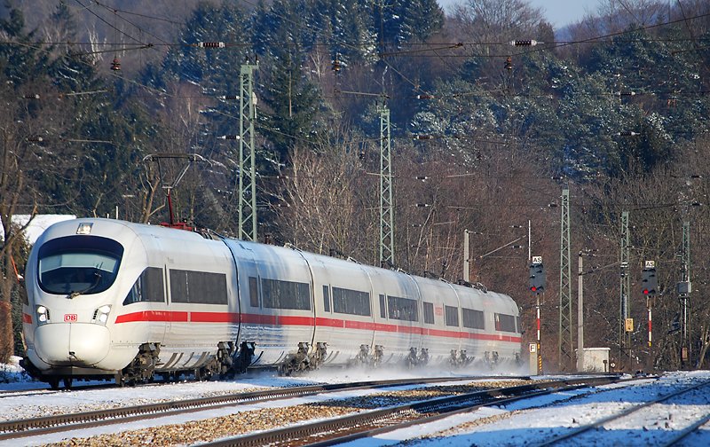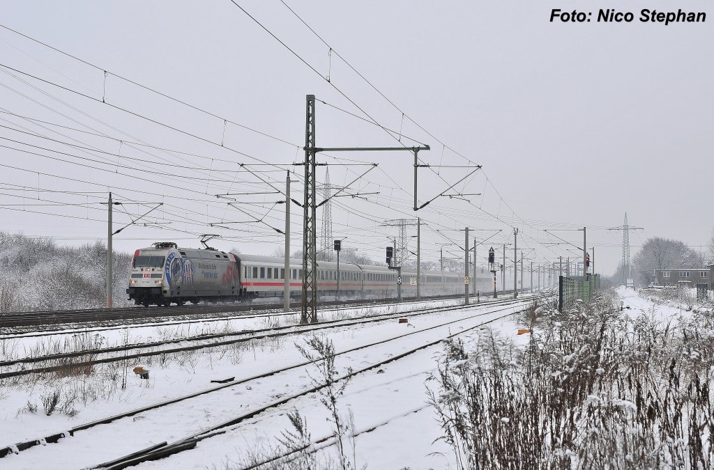Nach einem Standpunktwechsel konnte zuerst die für Hertha BSC werbende 101 144-4 mit IC 144 Berlin Ostbahnhof - Amsterdam Schiphol(Airport) festgehalten werden,Wustermark (20.01.10)