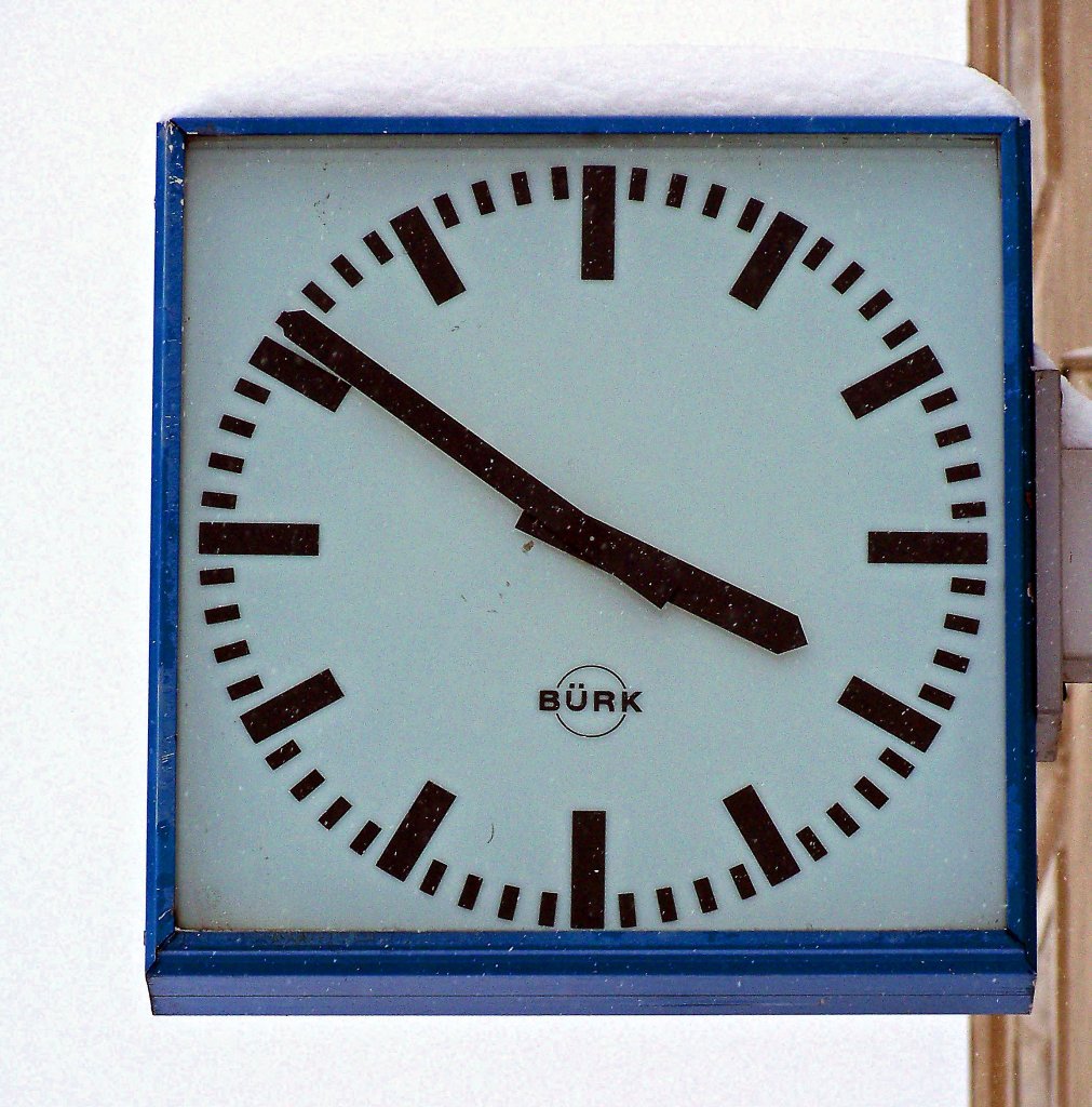 In der Nacht vom 26. auf 27.1.010 fiel die Temperatur auf unter -20°C - Das hat die Mechanik der Klingenthaler Bhfs.-Uhr nicht verkraftet. Die eine Hälfte steht auf 12:00, die zu sehende auf kurz vor 4 Uhr. Die Aufnahme entstand am 29.1.010, 10:40.
