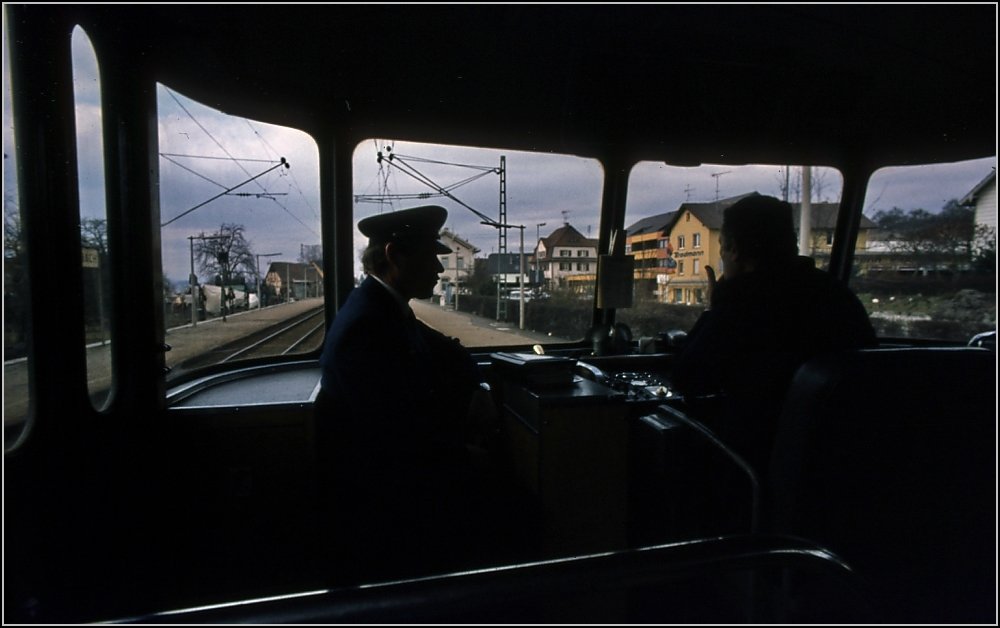 Schienenbus statt Seehas. Kurz vor dem Halt in Allensbach. (Februar 1979)
