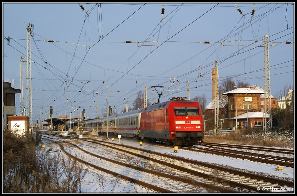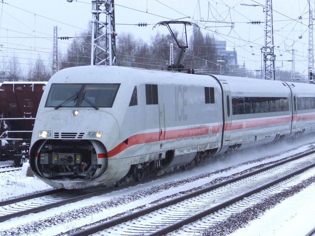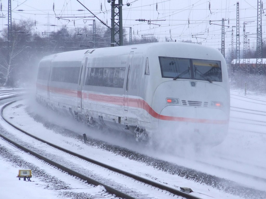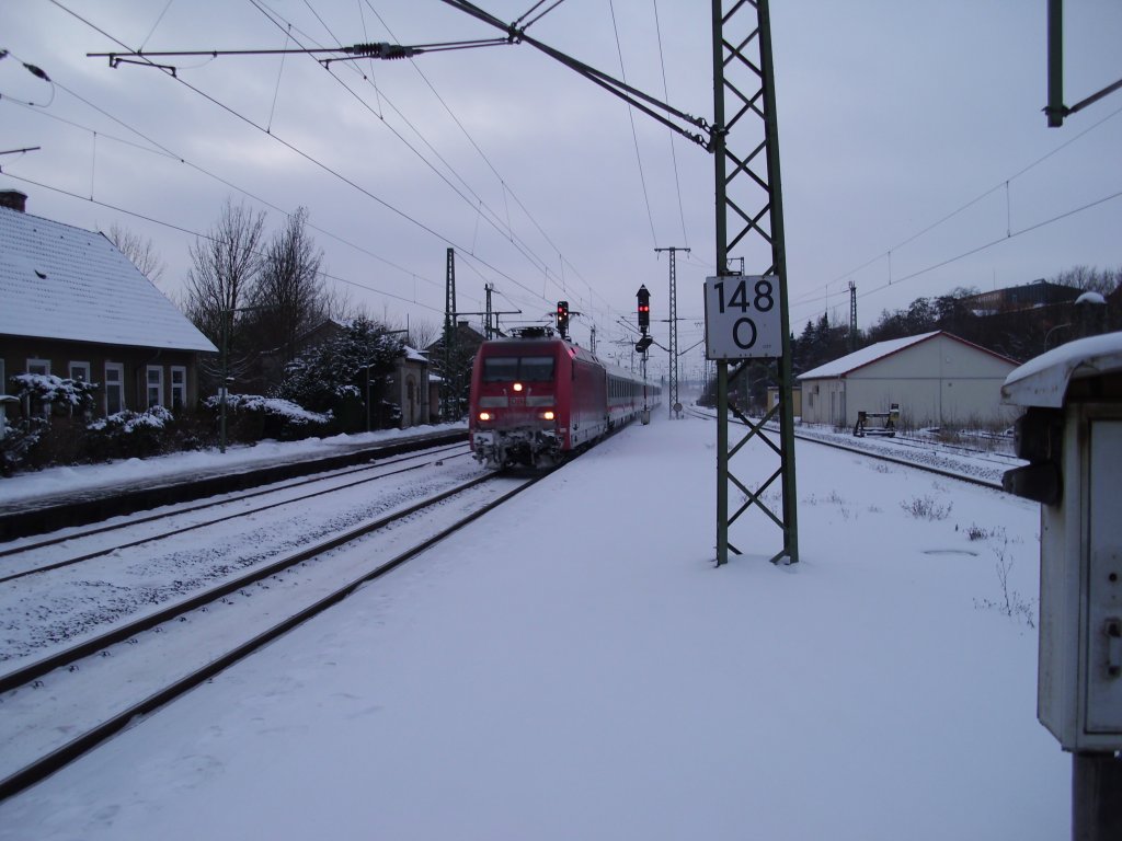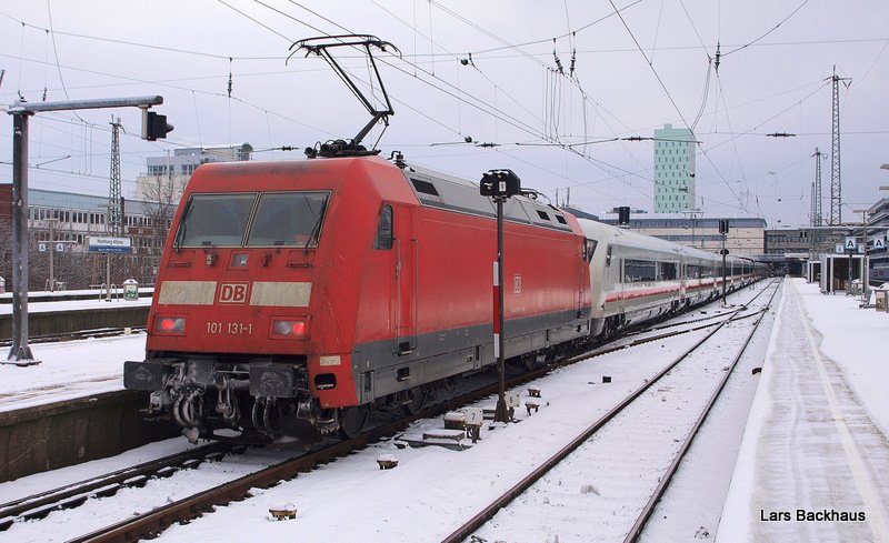 101 031 im dichten Schneegestöber in Hannover HBF mit dem IC144.