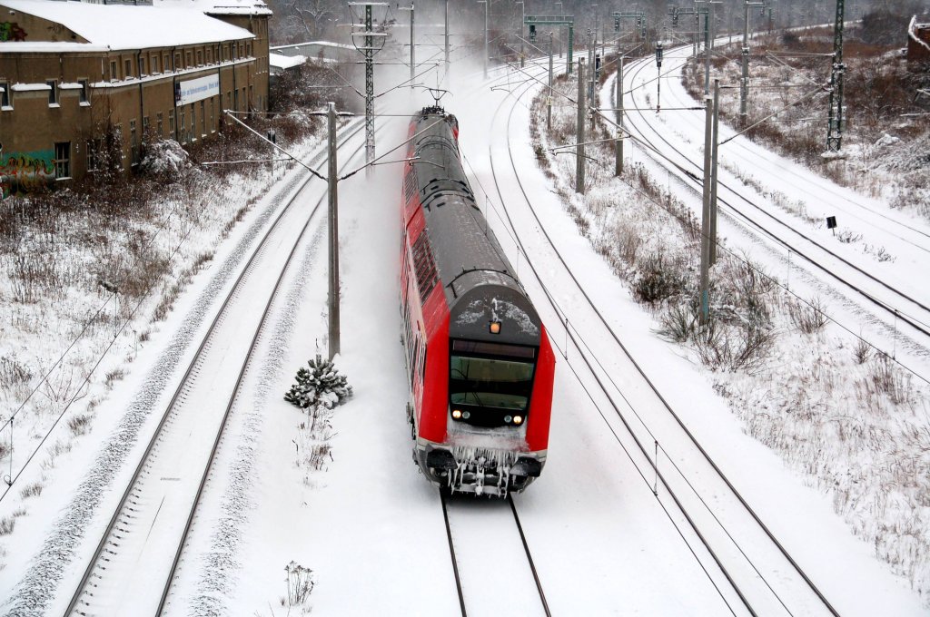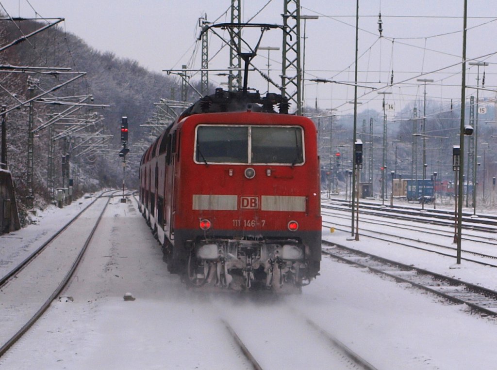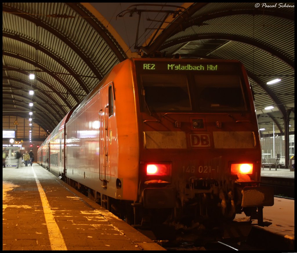Hier die in Mönchengladbach stehende vereiste 146 021-1 als Schub bzw. Zuglok des RE2 Dostoparks zu sehen, dieser endete hier.