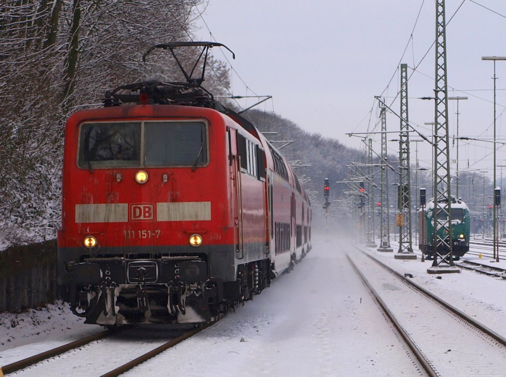111 151-7 zieht den RE4 (Wupper-Express) aus Dortmund in den Aachener Westbahnhof. Rechts im Bild sieht man noch eine 185er der Rail4Chem rangieren.