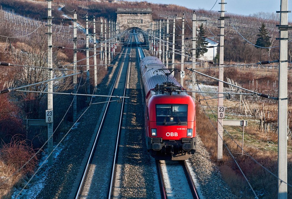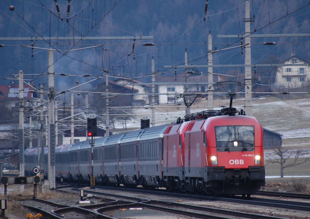 Nur noch bis zum Sommer gibts es ihn, den Transalpin. Am 4.1.2010 war der EC 162 mit 1116 262-5 und einer Schwestermaschine bei Schönwies auf dem Weg zum nächsten Halt, Landeck-Zams. Zu beachten ist der am Zugschluss fahrplanmäßig mitgeführte Panoramawagen.
