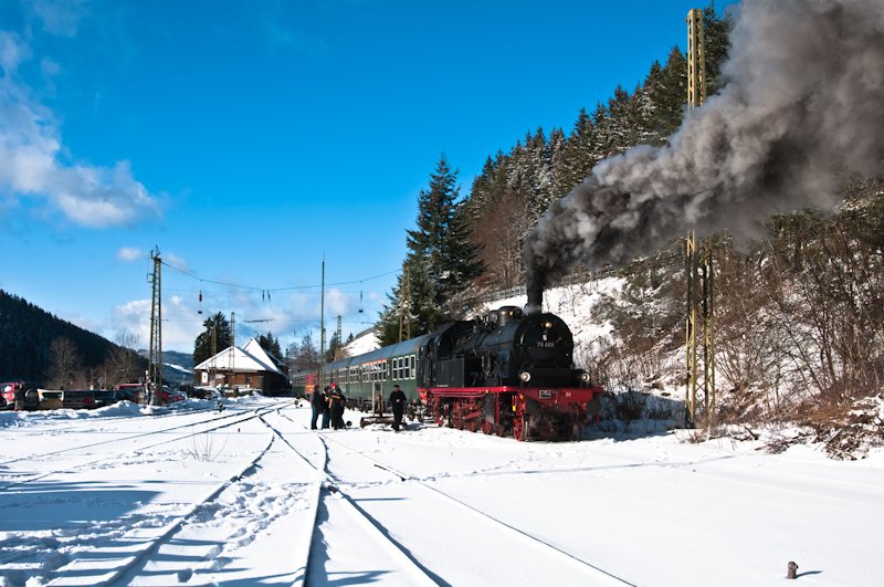 78 468 hat gerade Wasser gefasst und macht sich nun bereit den Zug wieder an den Bahnsteig zu drücken. Seebrugg am 2. Januar 2010.