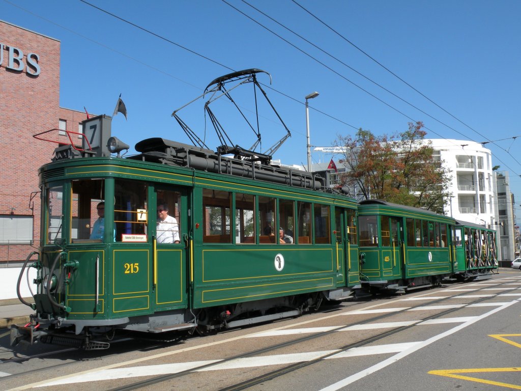 Am 15.08.2009 feierte man 75 Jahre Tram nach Binningen. Der Oldtimerzug 215 mit den Anhängern 423 und 1077 halten an der Haltestelle Markthalle.