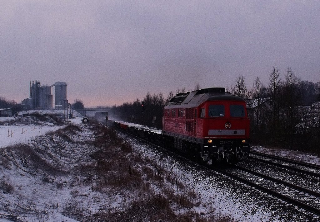 Am frühen Morgen den 4.01.2010 kahm uns die 232 457 mit einem ziemlich leeren Containerzug entgegen. Gruß an den Netten Lokführer. Aufnahme Dieselstrecke nahe Wahllastraße Regensburg.
