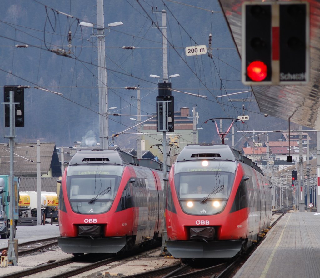 Da sieht man rot... Während 4024 086-3 abgestellt auf die nächste Leistung wartet kommt 4024 088-9 gerade aus Innsbruck in den Endbahnhof eingefahren. 4.1.2010