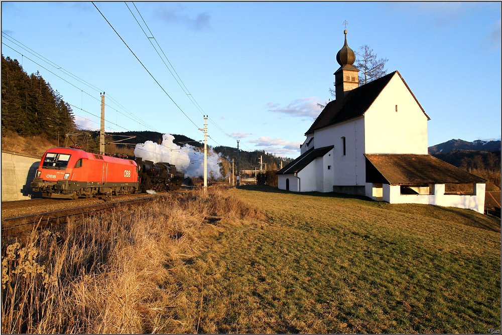 Dampflok 52.4984 fährt als SLZ 17025 von Mürzzuschlag zur jährlichen Revision nach Knittelfeld.Weil durch den Galgenbergtunnel nur Schmierdampf abgegeben werden darf, wird die 52er von Leoben bis Knittelfeld von der 1116 101 vorgespannt. Walburgakirche St.Michael 3.1.2009