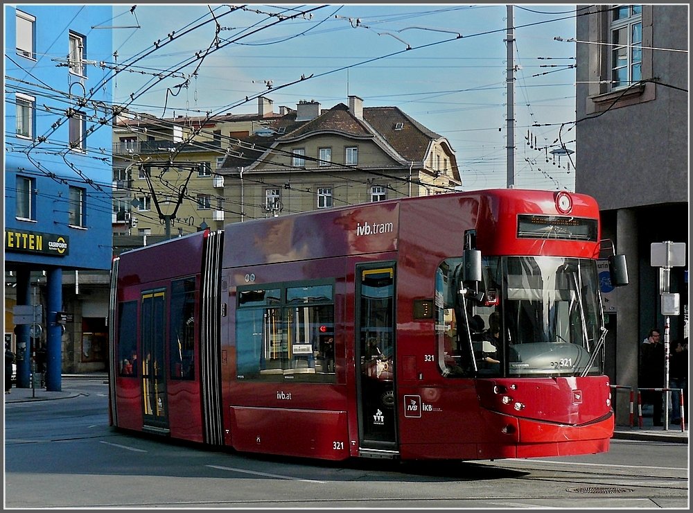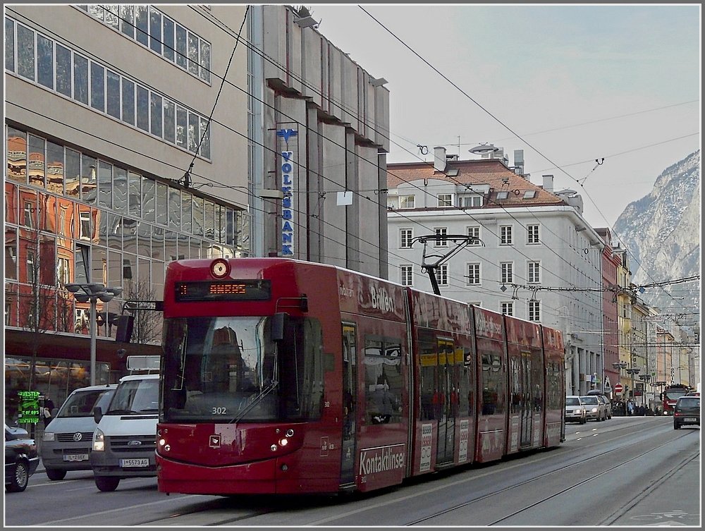 Der Staßenbahnwagen 302 durchfährt am 22.12.09 die Museumsstraße in Innsbruck. (Jeanny)