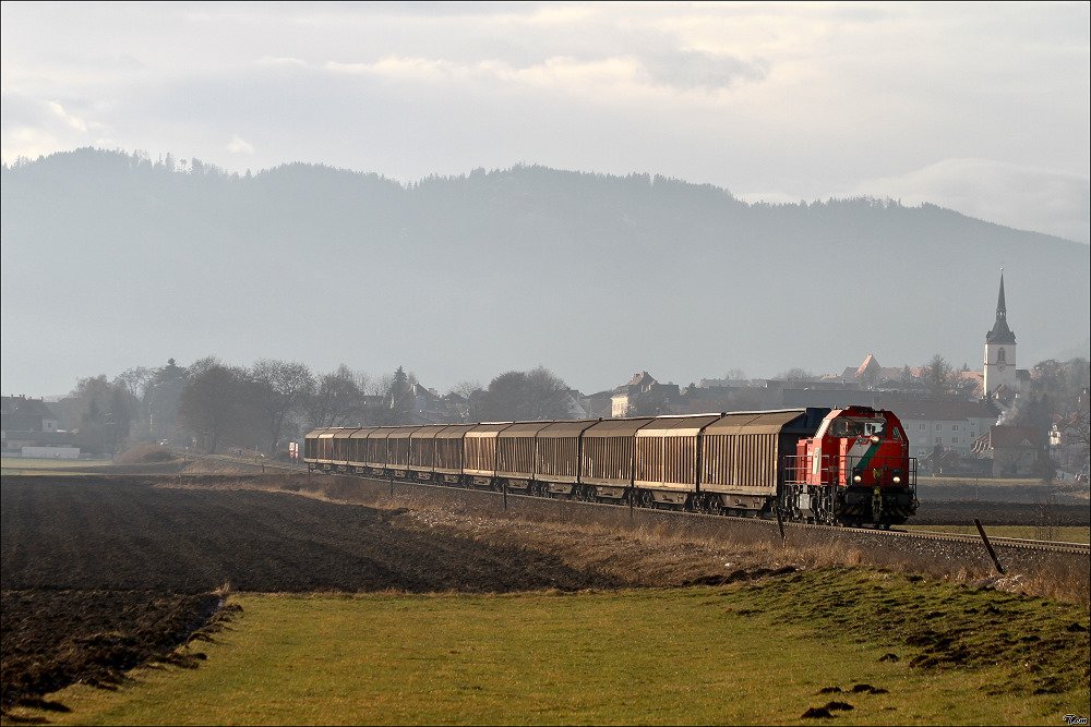 Gmeinder D6 der STLB fährt mit dem Zellstoffzug SGAG 93043 von Pöls nach St.Michael. Fohnsdorf 31.12.2009