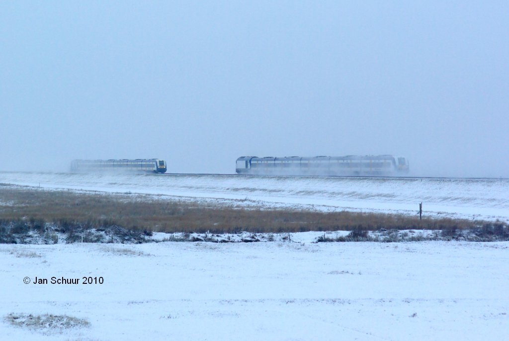 Sylt-Shutle am Ende der Weihnachtsferien am 02.01.2010 am Bahnübergang Klanxbüll West von Sylt kommend. Führend 218 364-8 im Schneetreiben. © Jan Schuur 2010