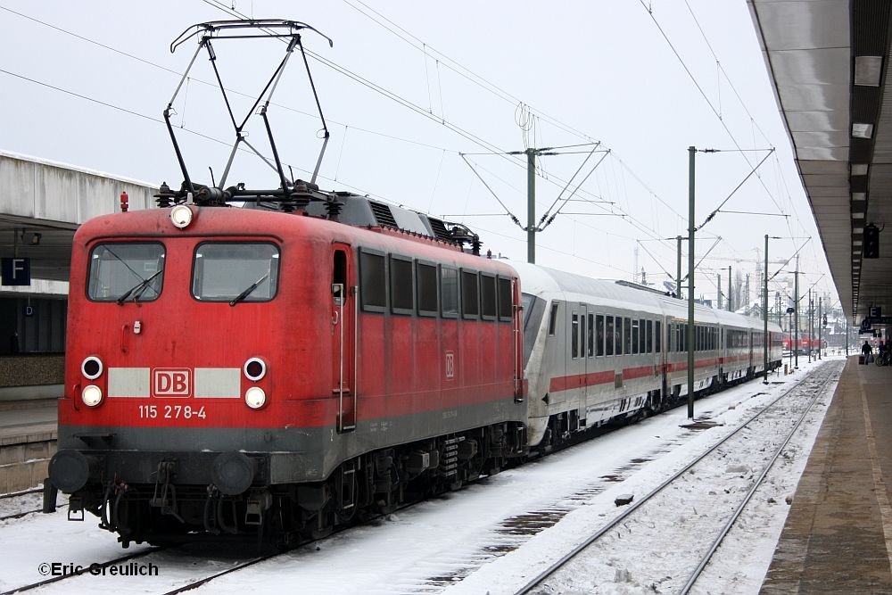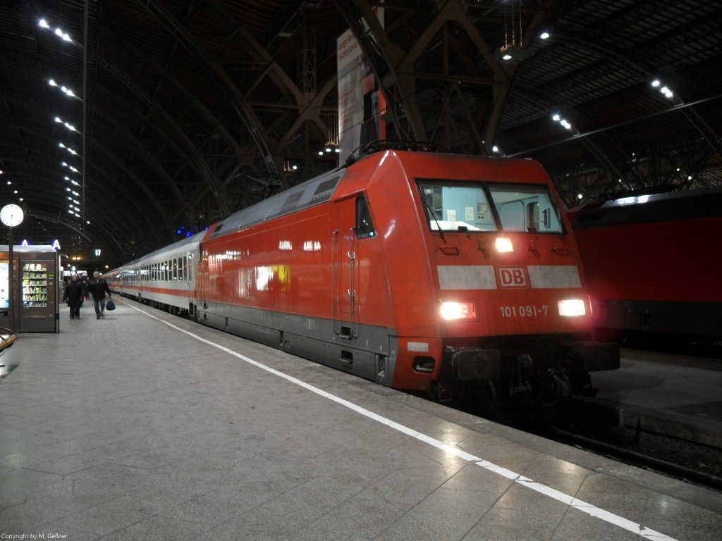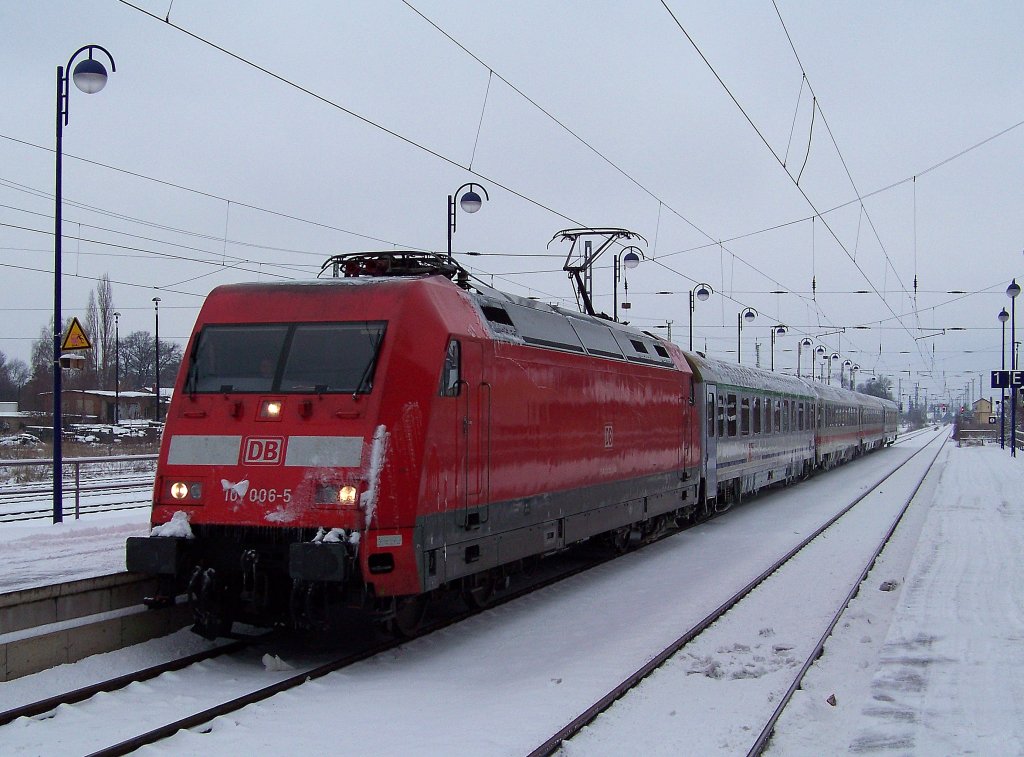 101 016 steht mit IC 2150 am 06.01.2010 in Bitterfeld. Im Hintergrund fährt gerade der RE nach Leipzig aus.