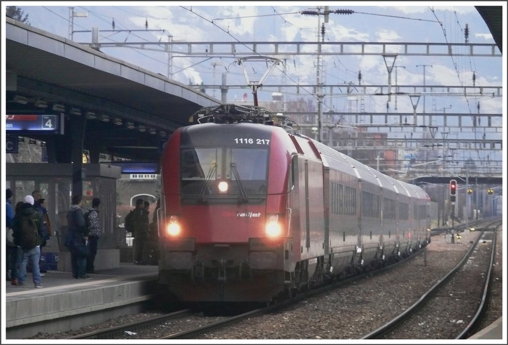 1116 217 "Spirit of Switzerland" erreicht mit dem RJ169 den Bahnhof Sargans. (04.01.2010)