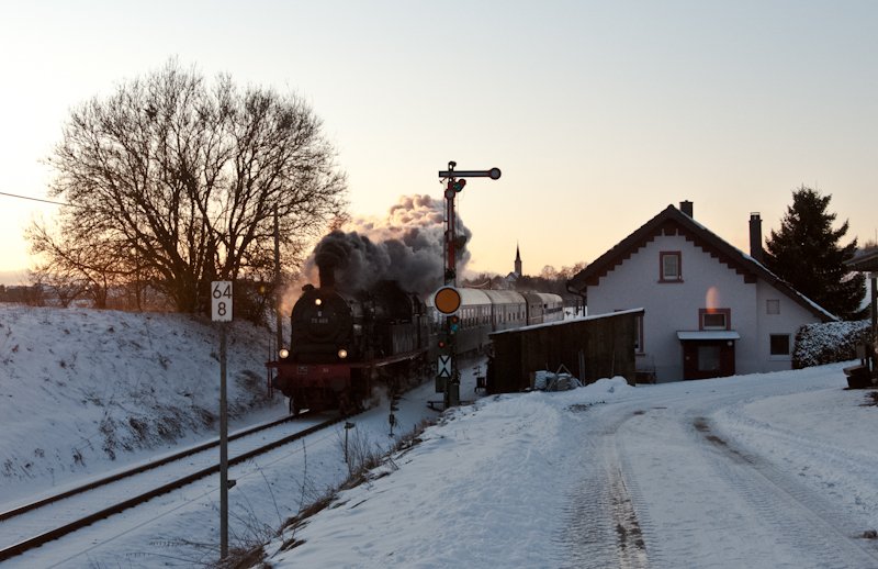 Am 28.11.09 fuhr die Eisenbahn-Nostalgie Chemnitz-Erzgebirge wieder einen Sonderzug durchs Erzgebirge. Die Garnutur bestand aus Wagen der Bauart Bag und Baag, bespannt war der Zug mit 52 8079-7. Die Reise führte von Stollberg über Chemnitz, Annaberg, Schwarzenberg, Aue und weiter über die Zwönitztalbahn nach Zwönitz zum dortigen Weihnachtsmarkt. Hier ist der Zug zwischen Wolkenstein und Thermalbad-Wiesenbad unterwegs. Leider hat sich die Sonne kurz vorm passieren des Zuges hinter einer Wolke versteckt. (Bildautor: Christian Paul)