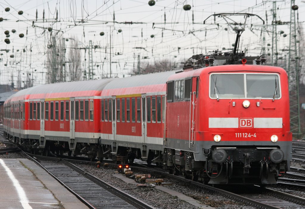 Die 111 124-4 zieht ihren RE13 aus Venlo gerade in Mönchengladbach HBF ein, aufgenommen am 27.12.2009