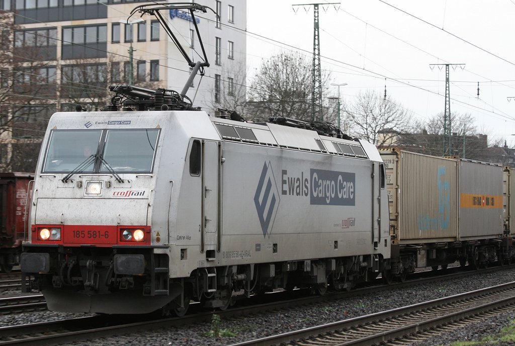 Die 185 581-8 der Crossrail mit Ewals Cargo Care Werbung zieht einen Gz durch Köln West am 29.12.2009