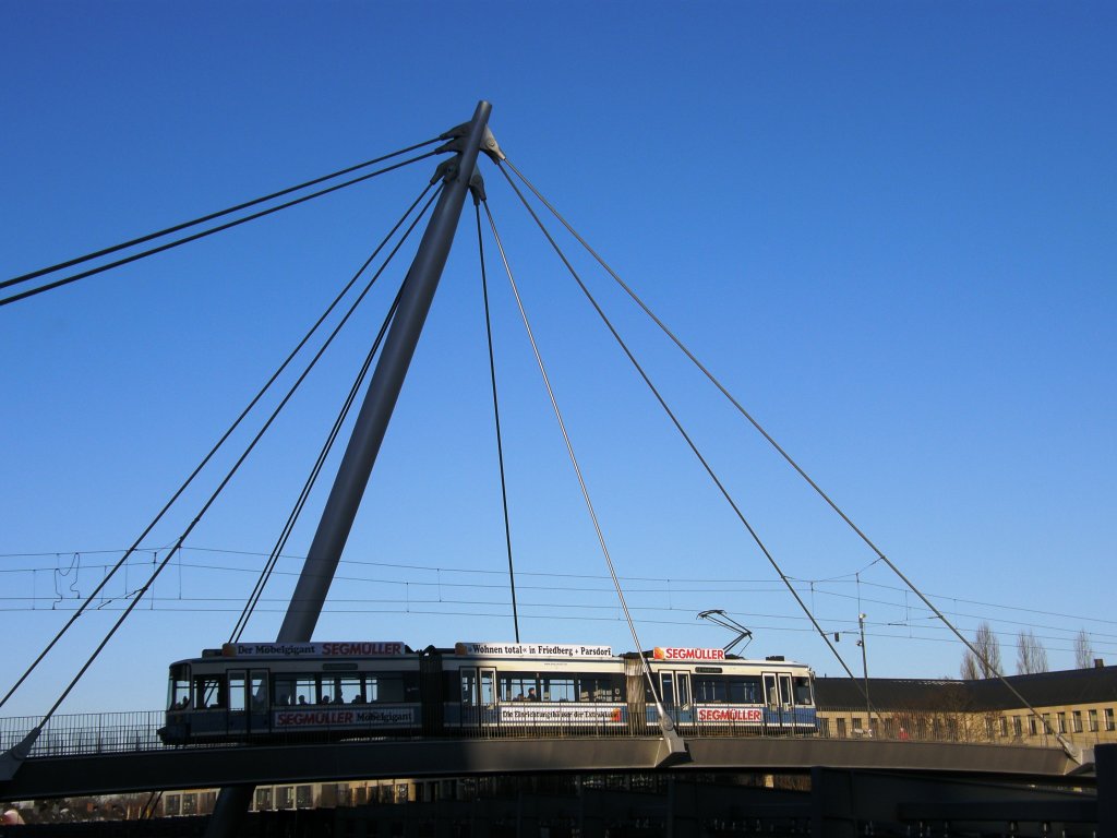 Ein R.2.2. der Linie 23 auf der neu errichteten Schrägseilbrücke über den Mittleren Ring. 4.1.2010