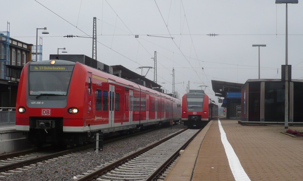 Der alltägliche  Quitschie-Verkehr  nimmt auch am ersten Tag des neuen Jahres kein End. Während rechts eine RB mit  Generation zu Kunft  aus Trier eingefahren ist und hier endet, wartet die S1  Mannheim  der Rhein Neckar S-Bahn, auf deren langen, bevorstehenden Rückfahrt nach Osterburken.