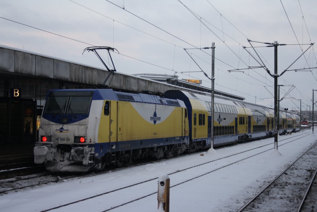 ME 146 14 schiebt einem Metronom von Göttingen anch Uelzen am 04.01.2010 um 08:40 in Hannover HBF