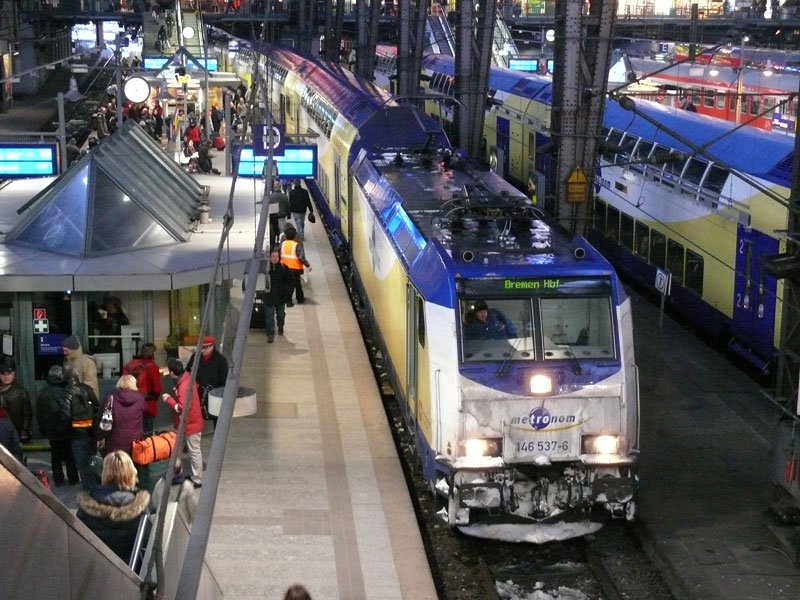 Nicht nur außen sondern auch drinnen in der Lok scheint es eisig zu sein, wenn man nach der Kopfbedeckung des Tf urteilt. 146 537 mit dem metronom ME 81164 abfahrbereit nach Bremen; Hamburg Hbf., 06.01.2010