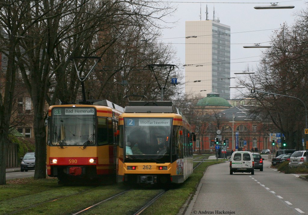Niederflur trifft auf Hochflur: 262 als 2 nach Wolfartsweier und 590 als S1 nach Bad Herrenalb in der Augartenstraße 13.12.09