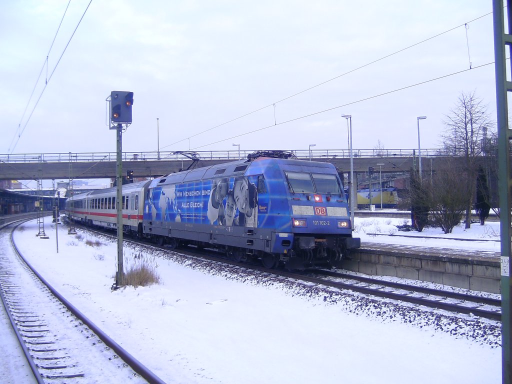 ROCO Lok "Wir Menschen sind alle gleich" 101 102-2 am 06.01.2010 mit Intercity im Bahnhof Hamburg-Harburg.