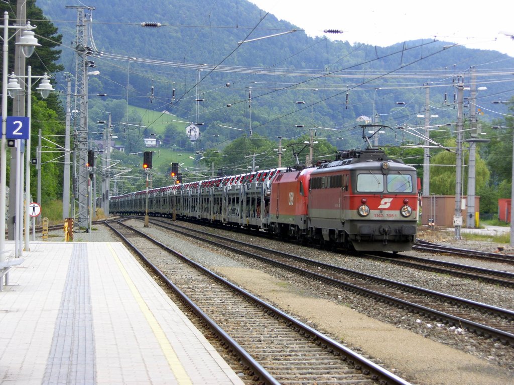1142 705-1 mit einem Autozug durch Payerbach Reichenau am 4.7.2010