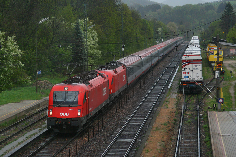 25.4.08 Auch 1216er verirrten sich darmals in andere Gegenden, wie es hier die 1216 147 beweist. Sie bespannt, vor einer weiteren 1116, den OEC 566 von Wien Westbahnhof nach Bregenz in Tullnerbach Pressbaum.