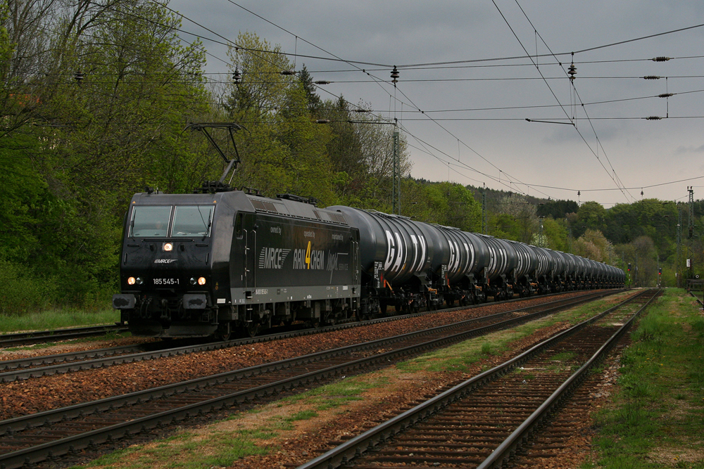 25.4.08 Einen recht interessanten (aber mir unbekannten) Kesselwagenganzzug bespannte die 185 545 und passiert den Bahnhof Tullnerbach Pressbaum.
