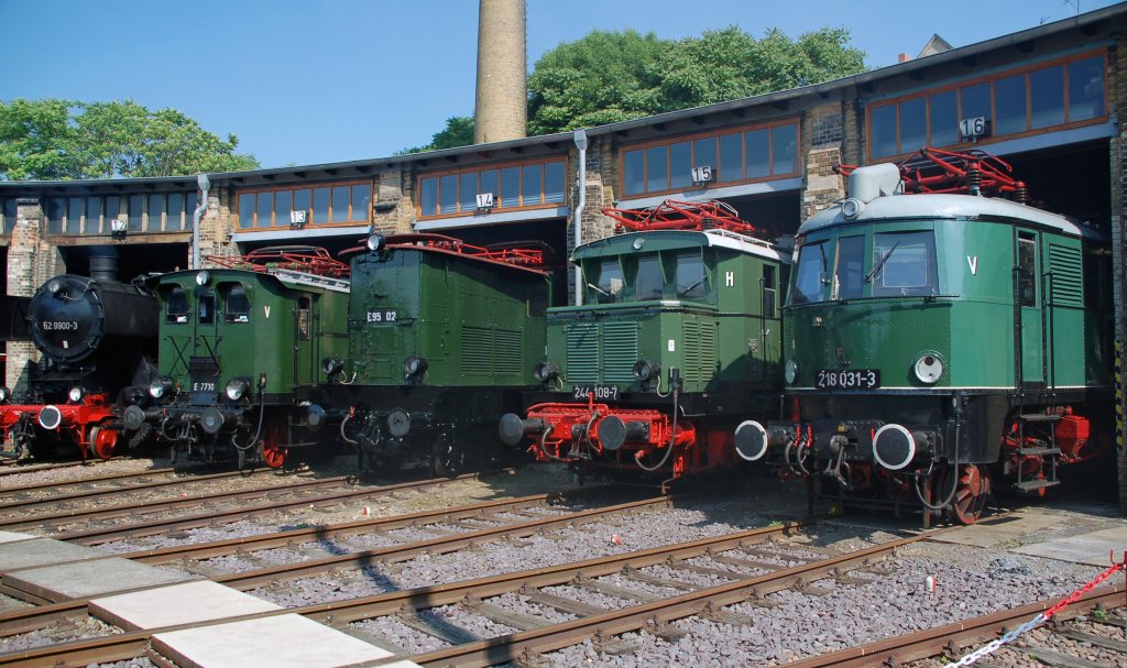 4 grüne Altbau-E-Loks waren ebenfalls am 03.07.10 im DB Museum Halle(S) ausgestellt. Neben der aus Dresden angereisten E 77 10 standen noch E 95 02, 244 108 und 218 031 am Schuppen.