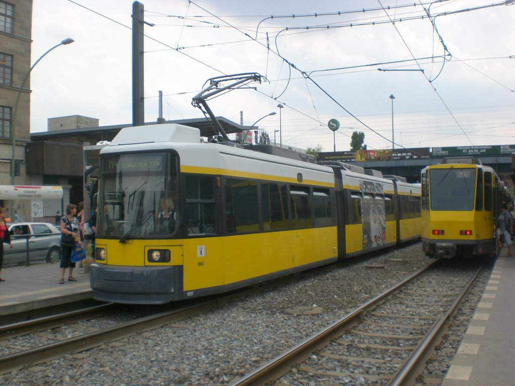 Berlin: Straßenbahnlinie M4 nach Hohenschönhausen Zingster Straße am S-Bahnhof Greifswalder Straße.(1.7.2010)