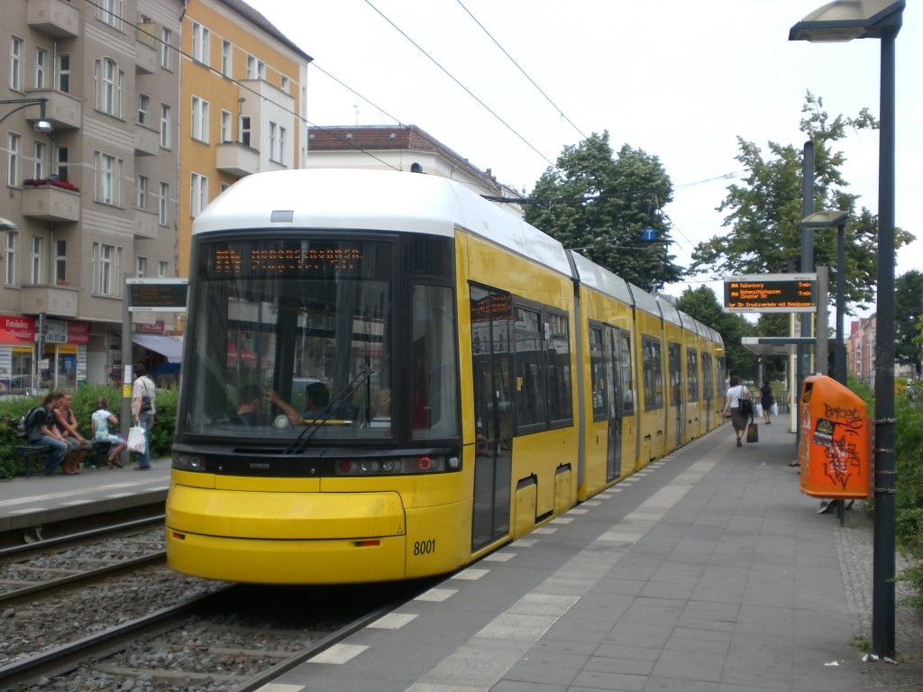 Berlin: Straßenbahnlinie M4 nach Falkenberg an der Haltestelle Prenzlauer Berg Hufelandstraße.(1.7.2010)