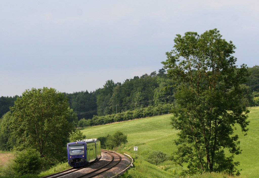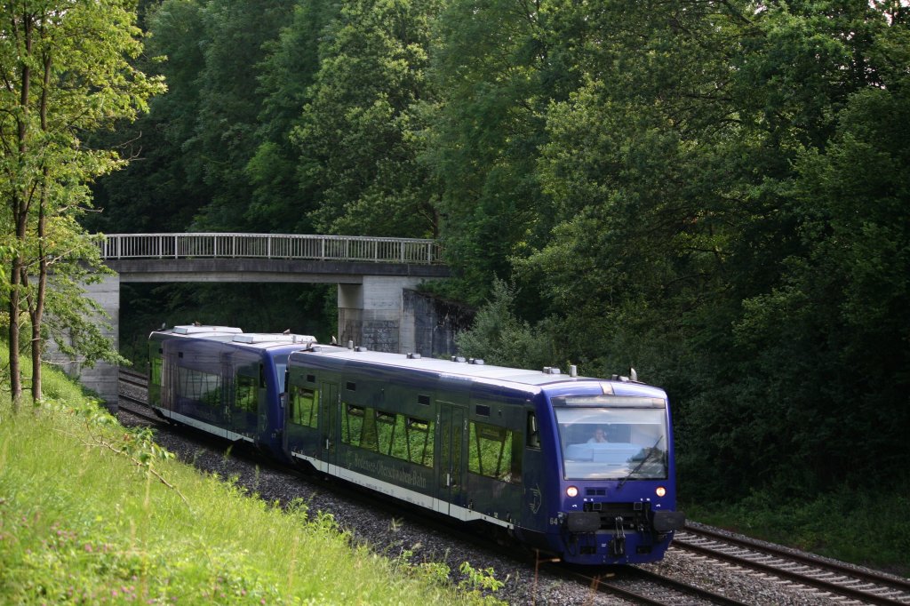 Die VT 64 und 67 der BOB sind auf dem Weg nach Aulendorf und befahren gerade den Streckenabschnitt zwischen Meckenbeuren und Oberzell, 05.07.10