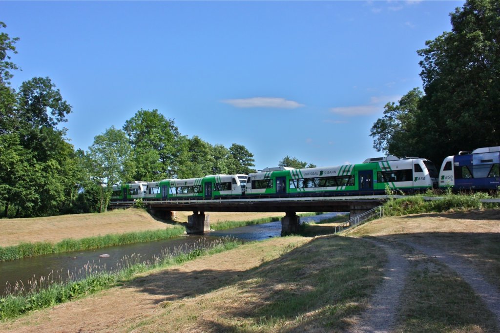 Auf dem Weg nach Breisach. Vier BSB Züge bei der Fahrt über die Dreisam.